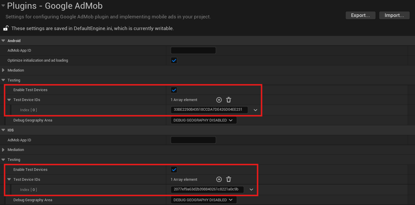 Go to Project Settings > Plugins > Google AdMob and paste the copied device ID into the appropriate Test Device IDs array: