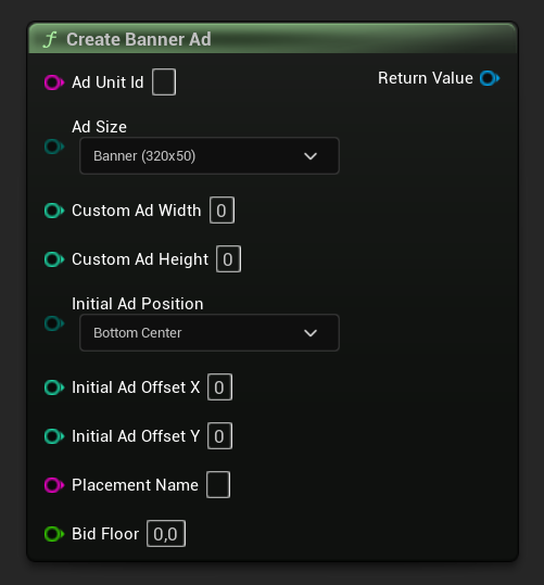 BannerAd = ULevelPlay::CreateBannerAd(TEXT("AdUnitId"), ELevelPlayAdSize::Large, 0, 0, ELevelPlayBannerPosition::TopCenter, 0, 0, TEXT("BannerPlacement"), 1.0);